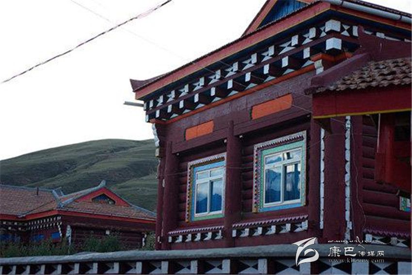 道孚民居的一般結構是以藏式木架穿逗,作為整體骨架,一般為二、三層;以片石或泥土砌墻,按正方形各邊7-10尺為空間立柱,四柱之間稱一空,一般房屋有16-30空,也有40、50空的。柱與柱之間有穿枋或原木鎖拉扯,其余維護結構由橫向平置,圓弧朝外的對剖圓木組成,它們層層重疊、四角交叉相搭,房頂高約5至8米。比起改進前,柱子直徑普遍加大,豪宅的柱子需兩人合圍,給人一種穩(wěn)重之感;底層和二層的木柱連體,并仿照內(nèi)地建筑的木穿逗式結構,梁柱接榫,形成一個牢固的整體,以增強抗震能力。外形多為四方形,二樓呈L形、凹形或回形,內(nèi)層結構是純木材,架“棒柯”或“棒勒”,間隔為各種用途的房間。房間上裝木望板,下鋪木地板,頂蓋用樺樹皮或硬雜木條墊底再鋪“阿嘎土”,日曬雨淋絕不漏水。屋架門窗外表的裸露部分,則多以油漆或自制的有色土染過,既防腐防蛀,又美觀大方。從外部看,二層平臺的女兒墻上,種滿了各種花草,房前屋后還種植了果樹。用泥土夯筑的底層和二層后方的土墻刷成白色,而木質(zhì)的半圓木墻體涂成褐紅色,窗框和窗扇均作彩繪,室內(nèi)裝飾也都用紅色等“火熱”的基調(diào)。各種色彩相互協(xié)調(diào)映襯,給人的印象特別深刻。