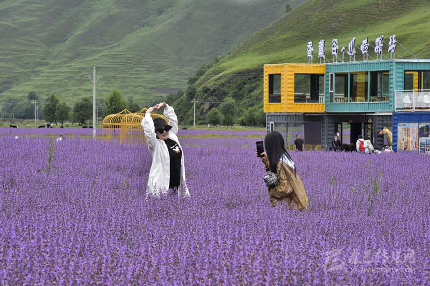 是時,微風(fēng)乍起,黛山環(huán)抱下的花海漾蕩著瀲滟的紫光,裹挾著無邊的浪漫和淡淡的芳香,向棧道上的游人涌來,彌漫到腳邊、四溢到身旁——踏訪這個藏在川西高原的“普羅旺斯”詩境實地,一幅美不勝收的“夏日高原送爽圖”令人心迷神醉。