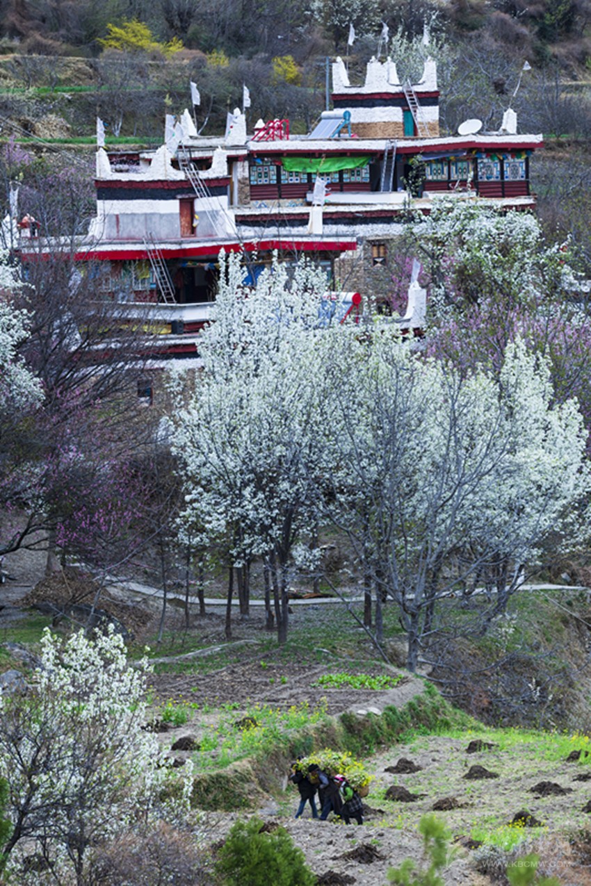 春天的丹巴,碧葉輕蕊,梨花堆雪。房前屋后,山腰山脊皆是滿眼的淡白梨花瓣。暖暖的微風吹過,滿樹的花瓣帶著泥土與花香撲鼻而來。藏寨、碉樓、繁花,美不勝收。