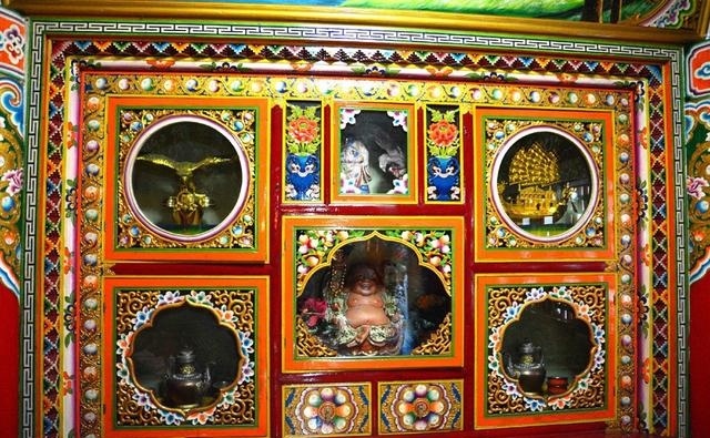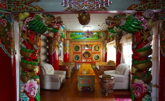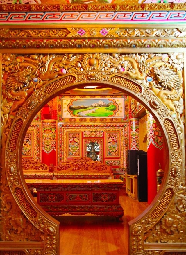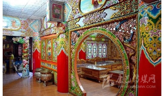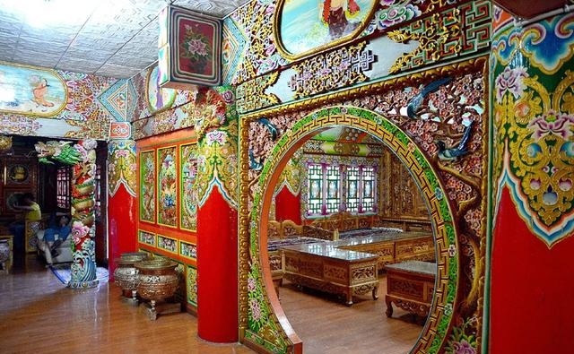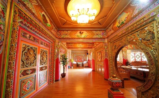 道孚民居室內精雕細鏤,描金繪彩,每一個圖案或圖畫就是一個吉祥物或一個傳說。民居客廳陳設豪華,富麗堂皇,極顯主人的富有;經(jīng)堂供奉佛像,酥油燈長明,是家中的清靜之地;臥室多用箱式或椅式藏床,陳設溫馨而別具風情。
