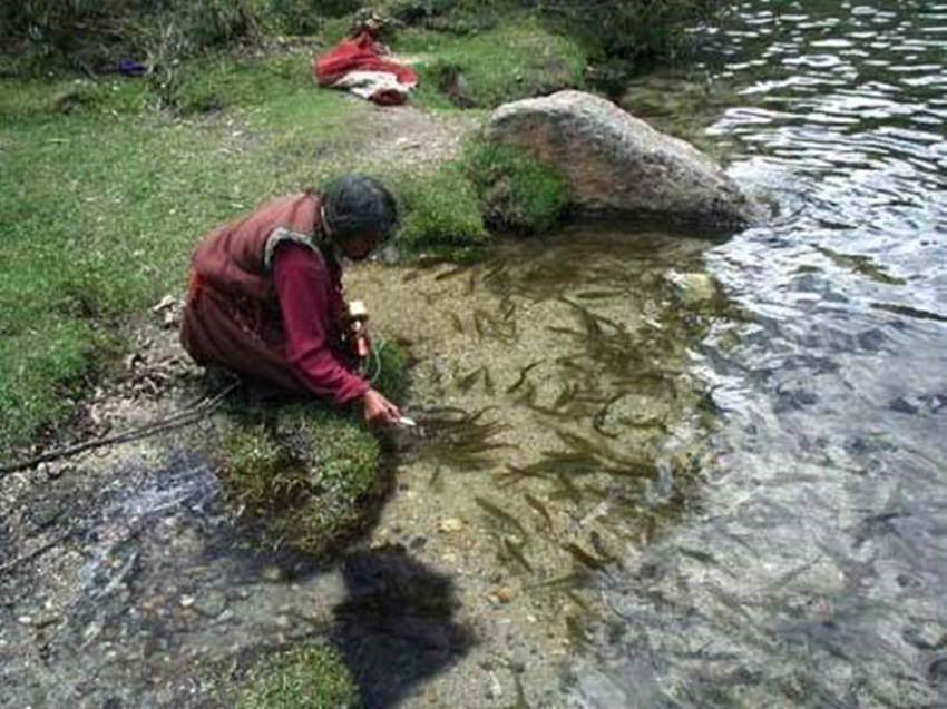 在湖邊的一塊平地上,有座被林莽掩映的廟宇,廟宇粉墻黛瓦,森嚴(yán)的大門(mén)銅環(huán)锃亮。棲息在原始森林中的藏馬雞與盤(pán)羊,跟寺院的喇嘛和尼姑建立了深厚的友情,相處得非常融洽。每年11月至來(lái)年5月,高山被茫茫大雪所覆蓋,大地披上了銀裝,這時(shí)候成群的動(dòng)物到低處覓食,寺院利用這個(gè)機(jī)會(huì),派人定時(shí)定點(diǎn)撒鹽巴和食物予以喂養(yǎng),漸漸使野生的動(dòng)物們不再怕穿紅色袈裟的人,到后來(lái)居然無(wú)所顧忌地進(jìn)入寺院覓食。