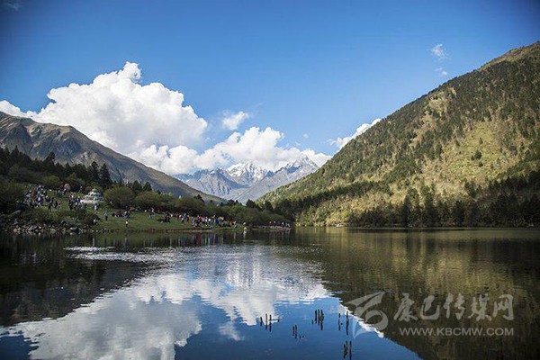 藥池沸泉一側(cè)是風(fēng)景秀美的俄瑪錯(cuò),上頂藍(lán)天白云和雪山,下踏森林綠水,讓人透心舒暢。