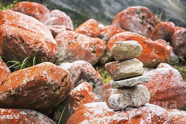 紅石灘的神奇之處并非因?yàn)槭瘔K因?yàn)楦缓撤N元素而呈現(xiàn)紅色,而是附著在石頭表面的紅色苔蘚。這種苔蘚據(jù)說只生長在海拔3000米之上的地方。