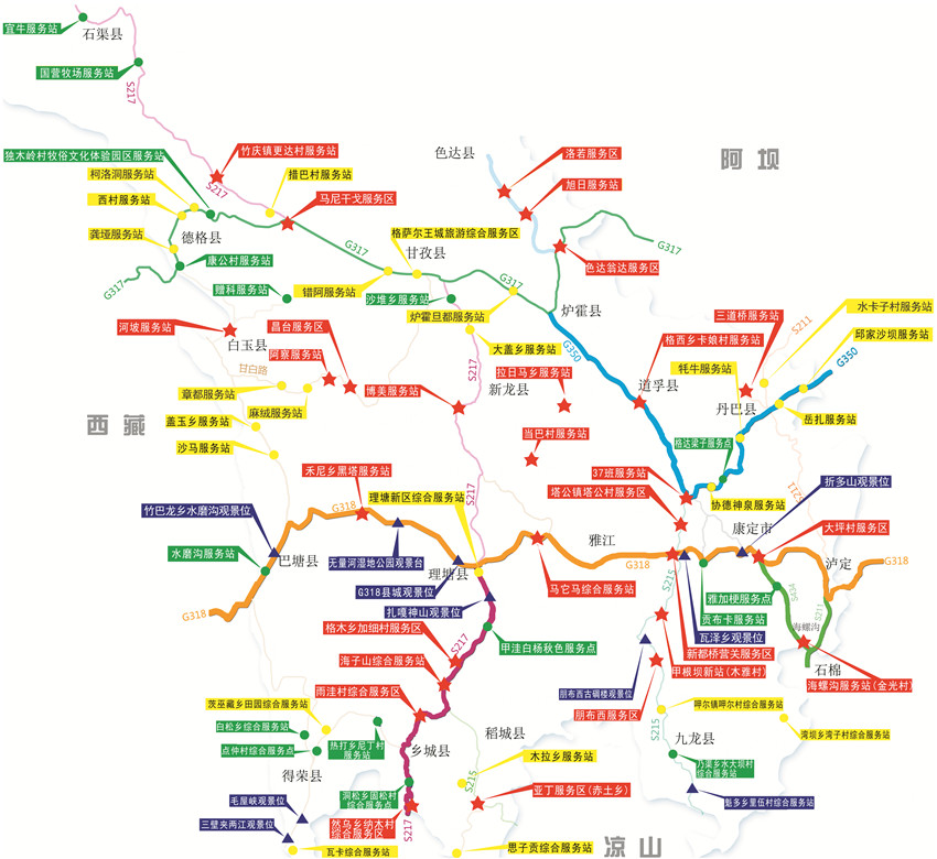 77個(gè)服務(wù)區(qū)(站、點(diǎn))地處我州六條旅游線(xiàn)路和十條景觀(guān)大道。主要集中在:G318線(xiàn)(瀘定——康定——雅江——理塘——巴塘),G350線(xiàn)(丹巴——八美——道孚——爐霍——色達(dá)),S217線(xiàn)(理塘——稻城——香格里拉鎮(zhèn)——亞?。?,S211線(xiàn)、S434線(xiàn)(瀘定——海螺溝——榆林)。