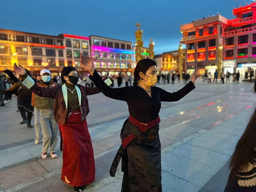 本網(wǎng)訊 每到傍晚時(shí)分,色達的金馬廣場(chǎng)上都會(huì )準時(shí)響起起歡快的鍋莊曲。 舞者們雙手隨音樂(lè )自然張開(kāi),邁著(zhù)輕快的步伐,踢腿、揚手、轉圈。游客們有的拿起手機拍照留念,有的則加入鍋莊舞的隊列。