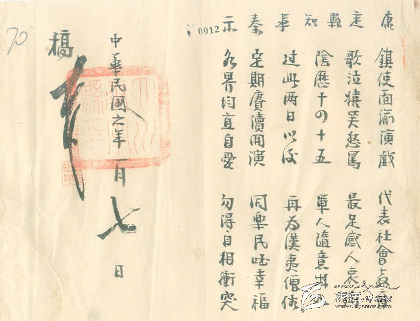 除此之外,康定縣知事又煞費(fèi)苦心地再寫了一篇“順口溜”式的告示,告示上寫道:鎮(zhèn)使面喻演戲,代表社會(huì)教育。歌泣嬉笑怒罵,最足感人衷曲。陰歷十四十五,軍人隨意出入。過此兩日以后,再為漢藏僧俗。定期庚續(xù)開演,同樂民國幸福。各界均宜自愛,不得自相沖突。