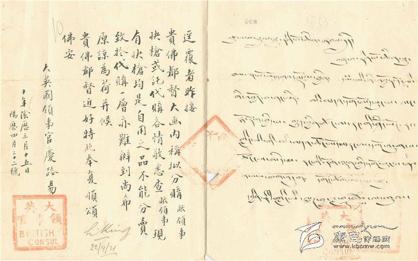 可以肯定的是,這就是給某位活佛的復(fù)信,除了稱呼佛都督(這是在當(dāng)時(shí)對(duì)活佛的通行的敬稱)可以看出外,還有藏文可以佐證。這張紙片上寫(xiě)道:昨接貴佛都督大函,內(nèi)稱,擬分購(gòu)敝領(lǐng)事館快槍或托代購(gòu)各情敬悉。查敝領(lǐng)事現(xiàn)有快槍均是自用之品,不能分賣。致于代購(gòu)一層,亦難辦到,尚希原諒為荷,并候貴佛都督近好,特此奉復(fù),順頌佛安。署名是大英國(guó)領(lǐng)事館官慶路易,日期為十年陰歷三月十五日,陽(yáng)歷四月二十二日。在公章下面注有公元1922年4月22日。