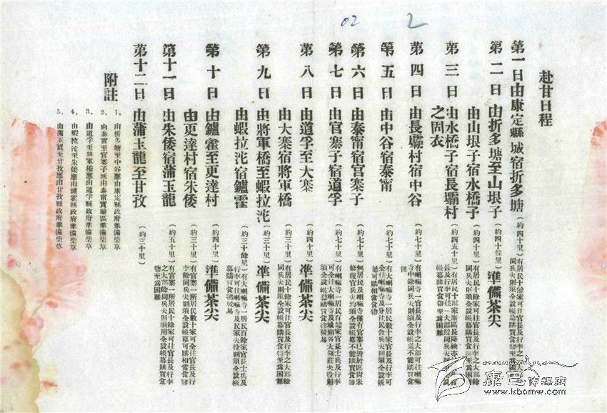 為了安排好戴院長(zhǎng)一行的行程,西康建省委員會(huì)專(zhuān)門(mén)發(fā)出了一份“訓(xùn)令”。這份時(shí)間表就是根據(jù)“訓(xùn)令”要求為戴院長(zhǎng)行程作出的安排。每天從何地到達(dá)何地,里程多少,休息地有無(wú)村莊、寺廟,接待力量如何、是進(jìn)房屋休息還是支帳篷都有說(shuō)明,而且對(duì)沿途各縣各地提出了包括應(yīng)準(zhǔn)備柴草、應(yīng)在哪些地方準(zhǔn)備“打尖茶”(午飯)等具體要求。