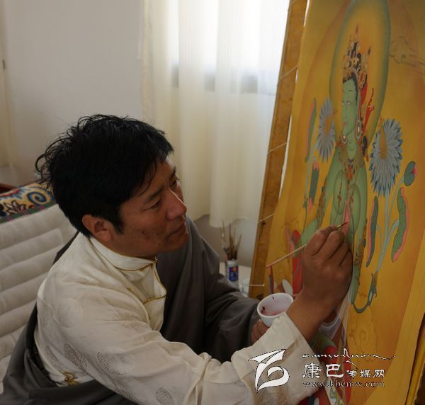 “如此工藝精細(xì)、筆法工整的繪制過程,必然注定價(jià)值的與眾不同。”記者話音未落,他便迫不及待地加以了例證:“比如,要繪制一幅長1.25米、寬1米的‘多派唐卡’,需要有近百個(gè)佛像,最小的佛像頭部只有指甲蓋大小,筆觸要求非常細(xì)膩,哪怕每天都堅(jiān)持畫十幾個(gè)小時(shí),至少也要一年多時(shí)間來才能完成。由于題材從宗教轉(zhuǎn)向世俗、審美從傳統(tǒng)走向現(xiàn)代、技法從圖像制作走向藝術(shù)創(chuàng)造,唐卡作為‘藏密文化’的概念正逐漸被世人所知,并成為唐卡藝術(shù)品市場上的寵兒。2012年3月18日,我和一級(jí)唐卡畫師丁嘎創(chuàng)作的《五度母像》長幅唐卡以168萬元的高價(jià)被收藏者購買,創(chuàng)下了‘多派唐卡’最高售價(jià)紀(jì)錄,‘多派唐卡’也因此成了公眾與輿論關(guān)注的熱點(diǎn)和焦點(diǎn)。”