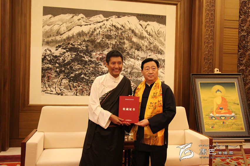 產(chǎn)業(yè)化發(fā)展的探索之路,不僅圓了年敘·多吉頓珠的“文化產(chǎn)業(yè)夢”,而且也讓他實(shí)現(xiàn)了一次華麗轉(zhuǎn)身,成為一名有擔(dān)當(dāng)?shù)钠髽I(yè)家。今年9月5日至15日,由中華文化發(fā)展促進(jìn)會(huì)、西藏自治區(qū)文化廳、西藏自治區(qū)文學(xué)藝術(shù)界聯(lián)合會(huì)、西藏自治區(qū)文化產(chǎn)業(yè)協(xié)會(huì)主辦,西藏崗地文化產(chǎn)業(yè)集團(tuán)、西藏拉姆拉綽唐卡畫院承辦的“西藏唐卡藝術(shù)——多吉頓珠、丁噶唐卡作品展“在北京中國國家博物館舉行。他和丁嘎先生現(xiàn)場向國家博物館捐贈(zèng)了《釋迦牟尼》、《五方度母》、《綠度母》和《觀音》四幅精品,這是國家博物館首次收藏多派唐卡和嘎瑪嘎智畫派唐卡,填補(bǔ)了國家博物館館藏嘎瑪嘎止畫派和多派唐卡的空白。國家博物館館長呂章申先生熱情為兩位大師頒發(fā)了收藏證書并激動(dòng)地說:“多吉頓珠先生和丁嘎先生捐贈(zèng)的精品力作,豐富了中國國家博物館的館藏,更好地弘揚(yáng)了西藏文化藝術(shù)。國家博物館有責(zé)任把最好的藝術(shù)品收藏起來,留存于后世。”