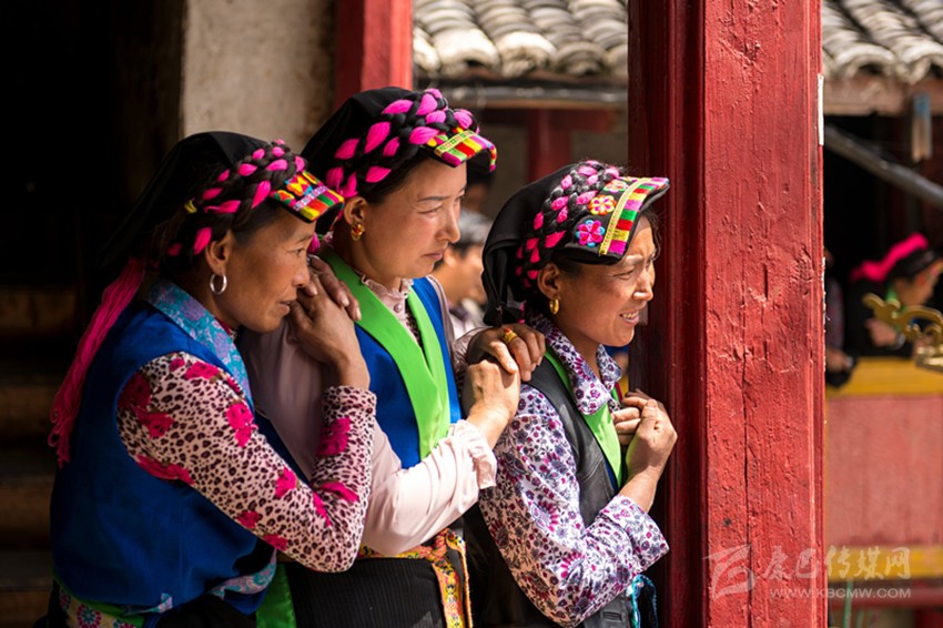 在魚通地區(qū),不少人還保持著古老的裝束,男子穿青色或黑色的長布衫,用布帶束腰,勞作或天冷時(shí)會(huì)在外加一件用動(dòng)物皮加工做成的皮褂子,老人以青布包頭,帕長約3丈左右,纏成大盤頭。女子也穿長衫,頭戴方形青色頭帕,腰系圍腰帕。頭帕繡有彩色花邊,發(fā)辮用青色、藍(lán)色或紅色的絨線盤于頭帕之上。圍腰帕為梯形,上窄下寬,邊緣用藍(lán)色或淺綠色布料做裝飾。圍腰帕分為兩種,一種繡著各種精美圖案,一般在重大節(jié)日和喜宴上穿戴,一種比較簡潔素凈,一般在日常生活中穿戴。