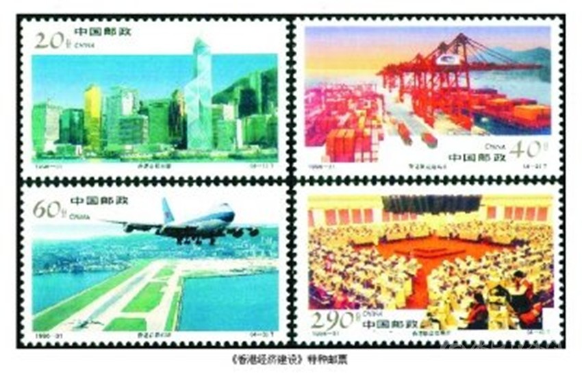在香港回歸祖國的進(jìn)程中,為了讓全國和世界人民認(rèn)識香港,了解香港,我國相繼發(fā)行了兩套介紹香港風(fēng)光名勝和經(jīng)濟(jì)建設(shè)的特種郵票。1995年11月28日,我國發(fā)行《香港風(fēng)光名勝》特種郵票,全套4枚。圖案分別為“維多利亞港灣”“中環(huán)廣場”“文化中心”和“淺水灣”;1996年12月19日發(fā)行《香港經(jīng)濟(jì)建設(shè)》特種郵票,全套4枚。圖案分別為“香港中銀大廈”“香港集裝箱碼頭”“香港啟德機(jī)場”和“香港聯(lián)合交易所”。