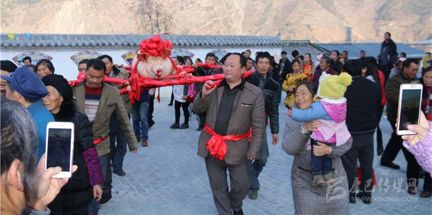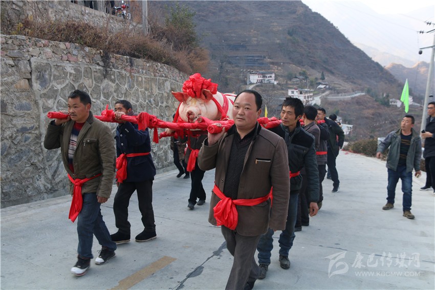 5個(gè)村民將年豬抬到秤上。360斤。村民為年豬準(zhǔn)備大紅花。準(zhǔn)備紙錢、香蠟。9點(diǎn)整,殺豬匠開(kāi)始了他的工作,在眾人齊心協(xié)力下,光溜溜的年豬被打整干凈?!氨S游覀兇鍋?lái)年風(fēng)調(diào)雨順、五谷豐登,村民平安健康。”村中老者敬過(guò)天地后,8個(gè)身強(qiáng)力壯的村民站在年豬旁,豎著拇指齊聲說(shuō),今年家家戶戶還要養(yǎng)大肥豬。抬著年豬,村里的中老年人簇?fù)碇咴谧钋懊?,唱著悅耳的民謠,大意是歌唱幸福生活的,迎著2018年的第一縷陽(yáng)光,村民們喜氣洋洋。到村里來(lái)的游客蜂擁拍照。