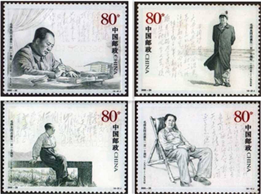 2003年12月6日, 中國郵政發(fā)行《毛澤東同志誕生一百一十周年》紀(jì)念郵票一套4枚,分別表現(xiàn)了毛澤東在西柏坡、毛澤東在北戴河、毛澤東在廬山、毛澤東在廣州的不同形象,背景以相應(yīng)的毛澤東詩詞書法襯托,偉人的豐姿躍然票上。這套以照片為基礎(chǔ)采用膠雕套印大票面黑白兩色的郵票,樸素大方,典雅大氣。郵票中的人物形象從面部表情到坐立姿態(tài),都顯出神采奕奕、栩栩如生。