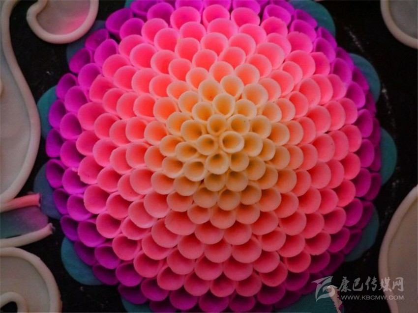 創(chuàng)作酥油花的工序是復雜、細致的:首先是確定油塑的題材,塑什么花,必須報請寺主審查通過;其次是揉和酥油,將各種顏料與酥油調(diào)和成彩色酥油;接下來是塑造基本模型,并按草圖扎制花架,涂塑鮮花的形體,將花朵、花葉、花莖安裝到花架上;最后,用金彩粉對整個酥油花進行勾勒和裝飾……酥油花終于宣告塑成。