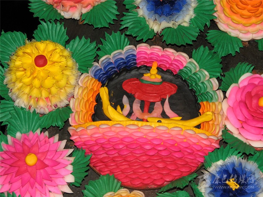 制作酥油花先是“扎骨架”根據(jù)所表現(xiàn)的內(nèi)容,用加工的柔軟草束、麻繩、竹竿、棍子等物扎成大大小小不同形態(tài)的“骨架”,即所塑造的基本模型。其次是“做胚胎”,塑造的第一道原料是用上年拆下來的陳舊酥油花摻和上草木灰反復捶打,制成韌性好彈性強的黑色塑造油泥。然后裹在骨架上完成粗糙但準確的一個個大造型,其塑法近似面塑或泥塑。再次是“敷塑”,塑造的第二道原料是在加工成膏狀的乳白色酥油中揉進各色礦物質(zhì)顏料,調(diào)和成五顏六色的油塑原料,仔細的涂塑在做好的形體上,有的還要用金、銀粉勾勒,完成各色形象的塑造。要是塑造紅花綠葉,或是玲瓏剔透的玉石寶玩,則直接用彩色油料一次塑成。為了防止塑制中因手的溫度而使酥油胚料融化變形,藝僧們在室溫控制在零度的作坊里,身邊放有一個盛有冰塊的水盆,他們要不時將手浸入冰水中。整個制作過程十分艱辛,藝僧們的手上大多會生出凍瘡。對佛教的虔誠和對藝術(shù)至美的追求,完全超越了肉體上的痛苦,冰冷的手中,艷麗的酥油花不斷生成。最后酥油花一道工序是“裝盤”,將塑好的酥油花按設計的總圖要求,用鐵絲一一安裝到位,固定在幾塊大木板上或特制的盆內(nèi),高低錯落有致,件件立體懸空,觀賞者可以從不同的角度觀瞻玩味。布局成單一的花卉圖案或整幅的故事畫面,俗稱“酥油花架”,展出時,“酥油花架”會用高桿立起,最高可達十幾米,人們在下以仰視角度觀看,更覺佛法莊嚴,寶像生輝。一座大的花架上,往往要塑造幾十個、甚至一二百個人物組成的故事畫面。其中菩薩金剛端坐安詳,飛天仙女身姿綽約,花鳥蟲魚栩栩如生,人物神形兼?zhèn)?,亭臺樓閣金碧輝煌,整個畫面繁而不亂,絢麗多彩,令人嘆為觀止。