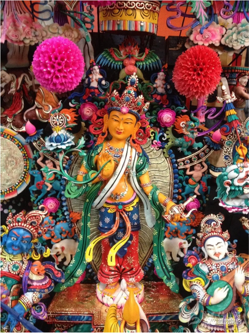 有傳說稱641年文成公主進藏,帶去一尊釋迦牟尼12歲等身像并將其供奉于拉薩的大昭寺,當?shù)厝罕娪盟钟妥龀苫ü┇I于佛前,以示崇敬之心,后各藏傳佛教寺院相繼使用,視為禮佛珍品,獻酥油花遂成為正月祈愿大法會的重要內(nèi)容。在發(fā)展過程中,酥油花的塑造方式、花色品種、內(nèi)容題材和工藝技巧都不斷發(fā)生著變化。