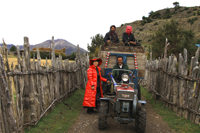 不久雨停下來,山邊露出一縷陽光,天空又是一片碧藍(lán)。我們趕緊繞道藍(lán)湖驛站后面的牧場上,發(fā)現(xiàn)一座臨時(shí)搭建的軍用鐵橋可是通向一個(gè)小島。走過去,島上景色更美,遠(yuǎn)處雪山冰川倒影晶瑩碧藍(lán)的水中,近處綠樹滿山,草場上牛羊星星點(diǎn)點(diǎn)。島上的小村莊叫阿日村,住著十幾戶人家,青稞剛收獲完畢,男人正忙著把牛羊過冬的草料堆積在高高的木架子上,女人除了撿牛糞外,還要準(zhǔn)備冬天取暖的柴薪。雖然村民大多不能講漢語,但對陌生人通常會(huì)含笑致意,一個(gè)小伙子還用結(jié)結(jié)巴巴的漢語重復(fù)了兩遍“喝不,青稞酒?”。我們到村民達(dá)娃卓瑪家,她是家里四個(gè)孩子中的老大,今年二十二歲,最小的弟弟不到五歲。她上過三年小學(xué),能講一點(diǎn)漢語,臨時(shí)充當(dāng)家人的翻譯。父母和奶奶見有客人來,非常熱情,立馬打酥油茶,并端上一盤奶渣,因?yàn)椴粫?huì)講漢語,只好不停招呼我們“吃,多吃”。家里的客堂兼經(jīng)堂寬敞干凈,廊柱和供案施以彩繪,供案上擺放兩個(gè)活佛的一尺見方的照片,前排供了酥油燈、糌粑和清水。