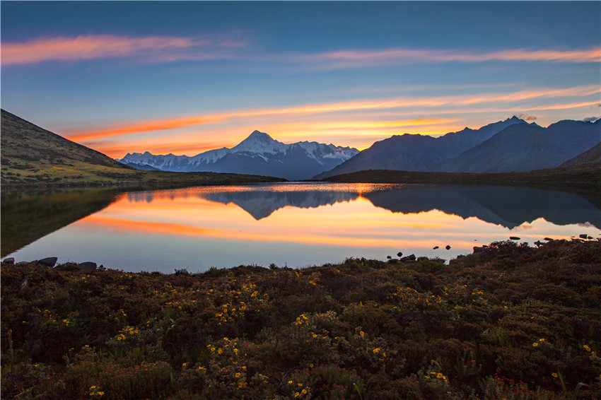 八月的康定本就二十多度,到山上溫度更低一些,加上這里的溪水不比別處的溪流,是雪山融化的水,因此,格外的冰涼。終于到了五色海的邊兒上,整個海子在眼前呈現(xiàn)。此時的五色海對于我們來說,可能不單單是個高山湖泊而已了,在我們抵達五色海之際太陽露出了笑臉,一切都是剛剛好。中午十分撤離五色?;氐叫∧疚?,吃過午飯開始下山。