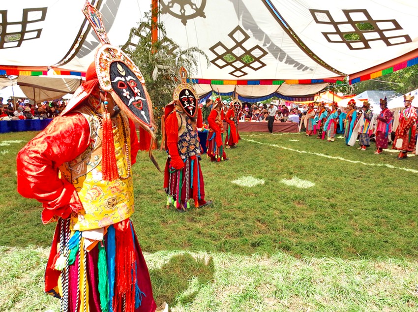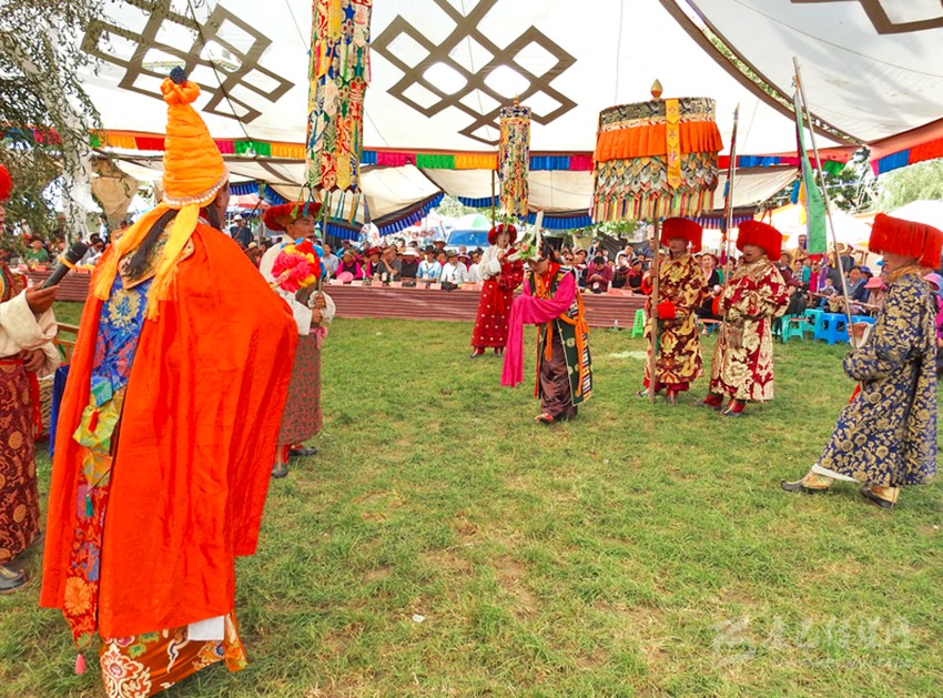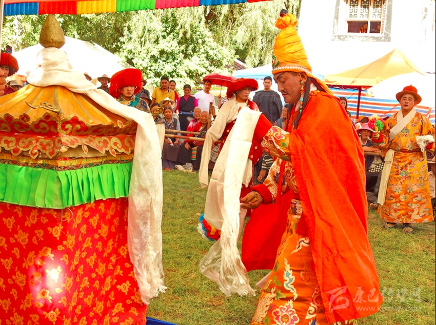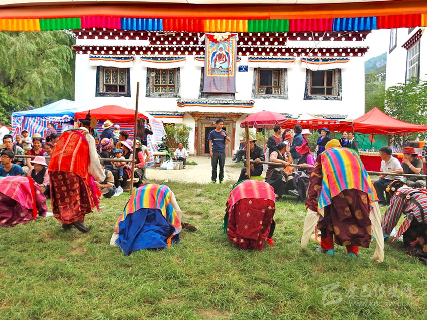 初次看到巴塘藏戲是康巴衛(wèi)視藏歷春晚,原以為是寺廟舞蹈,在唱聲杳杳里類似川劇的喉腔讓我覺得新奇,于是找些資料看看了巴塘藏戲介紹。藏戲的開山鼻祖唐東杰布。藏民歷來把他看作是創(chuàng)造藏戲的戲神和修建橋梁的鐵木工匠的“祖師”,是藏族人民心目中智慧、力量的化身。他將佛教經(jīng)典中的傳記同民間傳說、神話故事等內容融在一起,創(chuàng)作出一種具有人物性格和舞蹈、唱腔相結合的表演藝術,使過去單一的跳神舞逐漸地戲劇化,表現(xiàn)手段也不斷加強,并從宗教儀式中分離出來,形成了藏劇藝術的雛形。