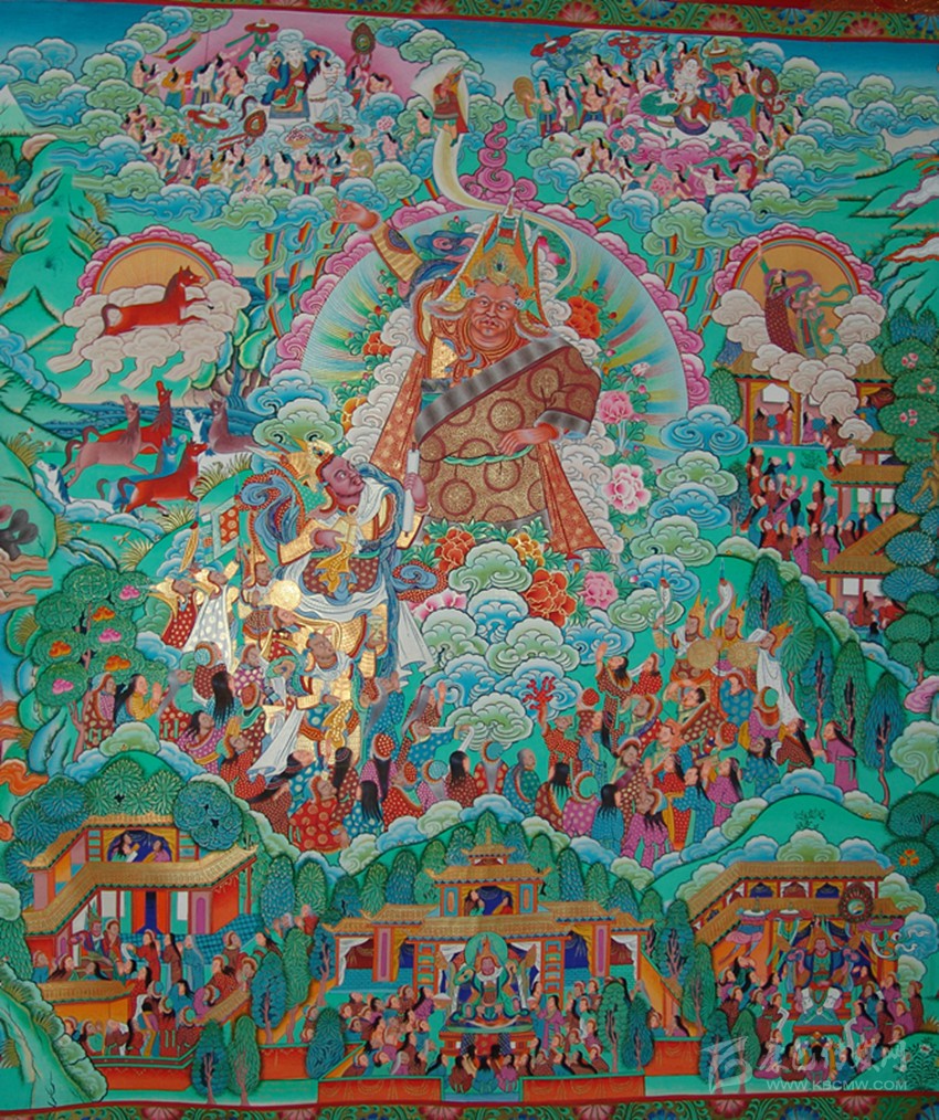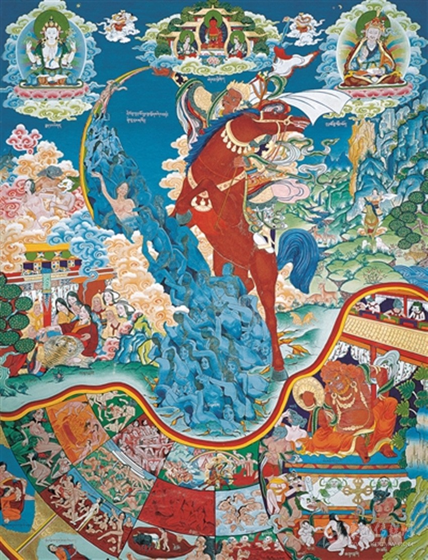 格薩爾唐卡,藏語叫“仲唐”?!爸佟奔础陡袼_爾》故事;“唐”即唐卡,“仲唐”就是畫有《格薩爾》內(nèi)容的唐卡畫。那么,唐卡與古老的藏族英雄史詩《格薩爾》之間又有什么聯(lián)系呢?作為民間文學(xué)的史詩《格薩爾》主要靠民間藝人的說唱得到繼承和廣泛流傳。為了加強說唱時的效果,一些聰明的藝人就以《格薩爾》為題材,繪制人物畫和格薩爾故事,類似佛教繪畫中的佛本生故事和高僧大德的畫傳,說唱時把它們懸掛起來,邊解釋,邊演唱。這種演唱形式,被稱作“指畫說唱”。這就是有關(guān)《格薩爾》最早的唐卡?!耙划嬕皇澜纭保谡f唱藝人們看來,在一幅并不很大也算不上很精美的唐卡里,整個大千世界、英雄格薩爾的輝煌業(yè)績,都包括在里面了。久而久之,成為一種專門的類型,稱作“仲唐”——畫有格薩爾故事的唐卡。