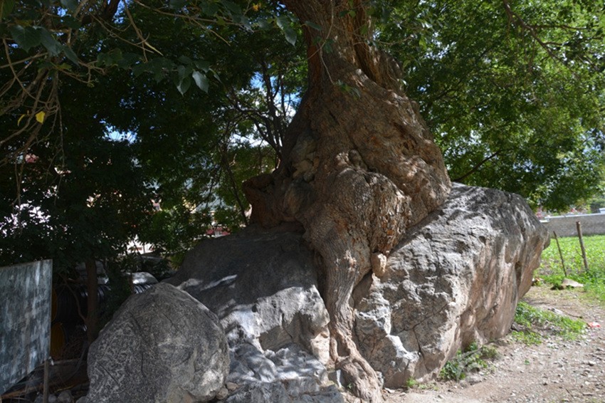 如今古桑抱石守衛(wèi)著巴塘這片熱土近千年,對研究巴塘的人文和氣候變化有極其重要的價值,保護好它理所應(yīng)當,擔心的是巨石旁長起兩棵皂莢樹,已比碗口還粗,大有后來居上之勢,若不未雨綢繆,必勢大難除。