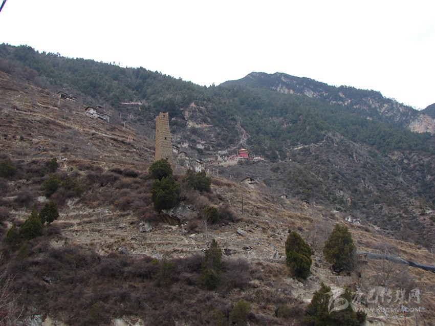 半山腰處,有三座高約三十余米的碉樓,因為建在山包之上,顯得更加的高大。古碉的外墻上,墻筋外露,層層疊疊,非常的美觀。在丹巴,人們習慣將這種墻筋外露的碉樓稱為母碉,而墻筋不外顯的則稱為公碉。這種母碉在丹巴的其它村落也可以尋覓到它的蹤影,不過如此密集修建在一起還不多見。