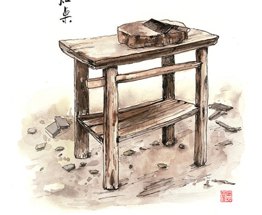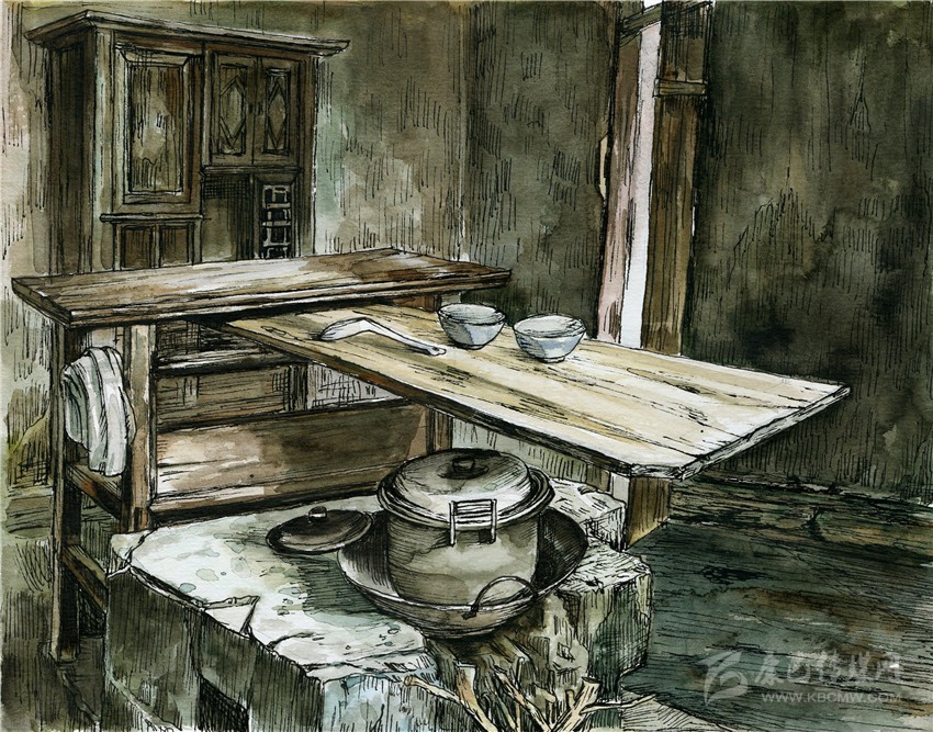 在我們家,灶屋里砌著一個(gè)四方形兩灶孔的大正灶,兩條寬板長凳靠墻擺放,交于墻角,像木匠的大曲尺,半圍著象征一家之主的正灶,其中一條正對著灶門口。灶與凳之間的通道,僅容曲膝而坐。灶上常年擱著烏黑的鼎灌和鐵鍋,灶的背面則立著一張長條狀的灶桌。灶桌是洗碗和切菜的地方,在其橫長的縫隙里插上接手板,懸空于灶面之上,擺上碗筷,又起到了飯桌的功能。灶屋進(jìn)門的另一面墻,靠墻而立的,是高高的碗欃和一個(gè)瓦水缸。碗欃是平素放碗放剩菜的地方,本是漆了老紅色,卻因西墻的木格窗小,光線幽暗,與四壁及樓板的烏黑融為了一體。水缸上口有一塊擱板,板上放兩只寬口瓦缽,缽里各放著一只竹筒水勺,一大一小。每天早晚,家人擔(dān)了木桶,挑來井水倒入水缸,此處的地面,長年潮濕。灶屋是我們一日三餐吃飯喝茶休息閑談的場所,煙火歲月,多是在此度過。我開蒙上小學(xué)后,每到夜晚,吃過飯后,將煤油燈盞移到寬板長凳,雙膝跪地,伏在凳灶之間的空隙里寫作業(yè),有時(shí)一不小心,額前頭發(fā)就被燈盞的火焰燒得焦臭。我自小愛學(xué)習(xí),成績很好,每學(xué)期都有獎(jiǎng)狀,老師夜里來村間家訪時(shí),也常來我家坐,是我父母最大的榮光。