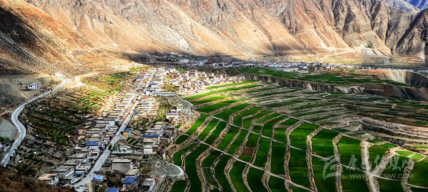 從得榮縣城出發(fā),途經(jīng)日龍鄉(xiāng),汽車順著盤山公路開始往下行駛,到半山腰處,司機(jī)輕輕踩一腳剎車熄火,在此作短暫休息。這時,我打開車門俯瞰金沙江畔的因都壩,但見公路兩側(cè)一排排整齊的房屋像火柴盒一樣連綴在平坦壩子上,房屋下端,麥田梯次舒展,麥浪涌動,蔚為壯觀。
