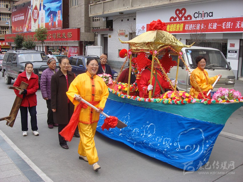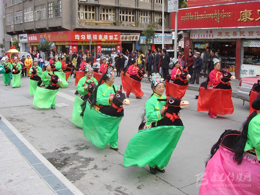 半個世紀(jì)風(fēng)靡康定城的“船燈”、“馬馬燈”、“鬧山鼓”、“扭秧歌”、“笑頭和尚戲柳翠”、“霸王鞭”……整個兒就像老陜過年時的“社戲”場面。大年初一、十五夜“出燈”游街,熱鬧氣氛把整個年節(jié)塞得滿滿的。記得我孩童時見過一次“出燈”游行,不是晚上而是在大白天(叫“出游”)。寺廟喇嘛吹奏佛樂走在前面,接著是“川北”人的川劇鑼鼓;再后面跟著的就是“馬馬燈”、劉老陜的“船燈”、鐵木社的“龍燈”、二輕局的“霸王鞭”、南門上的弦子隊(duì)、三居委的腰鼓隊(duì)、北三巷的“道孚鍋莊隊(duì)”……游行隊(duì)伍遇街口寬敞地方必圍圈演出?!叭死侠?,人老啦,人老先從頭上老,白的多來黑的少, 開——船——羅!”“銀須飄灑”的艄公劉老陜用俏皮逗趣的陜腔告白開場詞,在歡喜鑼鼓的伴奏中“劃”著旱船出了場。旱船闖“急流”、過“險灘”,風(fēng)趣又逼真;如果哪家的姑娘打扮成古裝戲里的嬌美仕女坐上旱船游了街,那她立馬就成了康定城人皆贊譽(yù)的“美女”。接著就是“馬馬燈”,幾十個“騎馬橫槍”的古裝將士馳騁上場,排兵布陣,穿梭并行,“馬”鈴聲鼓樂聲交織一起……鬧翻了康定城的“三山二水”。