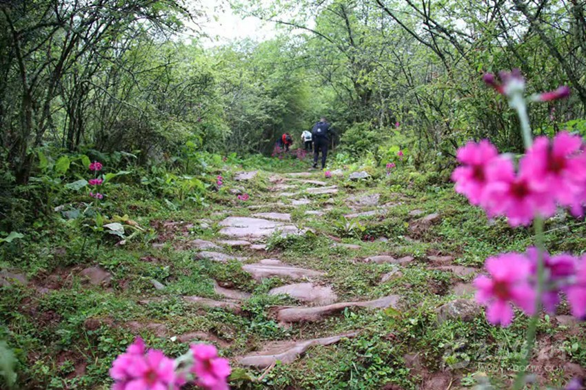 古道崎嶇,路險(xiǎn)泥滑,穿溪越澗,我們相互鼓勵,相互幫助艱難下行。半山的坡地林間,三五株一束,七八株一叢,殷紅的報(bào)春花滿山遍野,染紅延綿起伏的山坡。