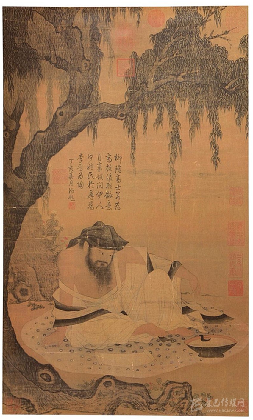 陶淵明曾說:“夏月虛閑,高臥北窗之下,清風(fēng)颯至,自謂羲皇上人?!币粋€(gè)高人隱士酒后高臥草廬窗下,悠閑自得乘涼的形象躍然紙上。唐代詩人李白非常向往陶淵明恬淡閑逸、與世無爭(zhēng)、天人合一的隱逸生活,寫詩曰:“陶令日日醉,不知五柳春。素琴本無弦,漉酒用葛巾。清風(fēng)北窗下,自謂羲皇人。何時(shí)到栗里,一見平生親?!北磉_(dá)了對(duì)陶淵明人品和理想的仰慕之情?,F(xiàn)藏于臺(tái)北故宮博物院的宋人《柳蔭高士圖》即是此意境。據(jù)《石渠寶笈》記載,此圖為素絹本著色畫,左方下有孫承澤印,右方下有北平孫氏印,左邊幅有棠村審定、蕉林二印。只知為宋人之作,相關(guān)的背景則無從查考。畫中為一棵古柳樹,樹干虬曲剛勁,枝葉繁茂。樹下一翁,美髯飄忽,袒胸露腹,頭戴葛巾,赤足席地而坐。坐前有一幅展開的手卷,酒樽滿盈,淺斟低酌。表面上看此翁雙目聚神,凝視手卷,實(shí)則已是眼餳耳熱,醺醺然不勝桮杓。清乾隆皇帝對(duì)《柳蔭高士圖》十分喜愛欣賞,在畫上御筆題詩云:“柳蔭高士若為高,放浪形骸意自豪。設(shè)問伊人何姓氏,于唐為李晉為陶。”乾隆帝說,這位高士如是唐人就是李白,如是晉人便是陶淵明。但是從服飾和環(huán)境看,應(yīng)是五柳先生陶潛也。這幅圖所表現(xiàn)的就是“心靜自然涼”。