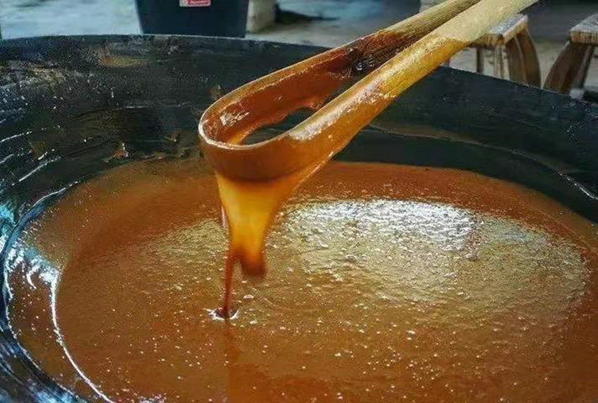 姐姐做好了午飯,我也完成了燒火任務(wù)。母親退掉了灶里燃燒的柴火,留下猩紅的火炭,將一瓢早已準備好的麥芽漿倒入煮好的漿糊中,加水攪拌均勻后靜置。直到吃完午飯,我們即將出發(fā)去大伯家時,我看到鍋里的漿糊上面析出一層透明的液體。此時母親又點燃了灶火繼續(xù)熬煮兩鍋漿糊,煮開后進行過濾。再將濾出的糖水倒入洗凈的大鍋中熬煮。