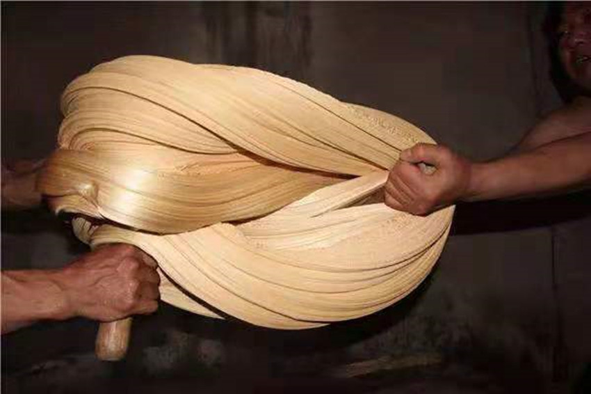 扯糖也是熬糖過程中十分關(guān)鍵的一個環(huán)節(jié)。剛出鍋的糖溫度可達兩三百度,徒手是不敢去觸碰的,扯糖需等到麻糖變得溫熱才能進行,但又必須在它完全冷卻之前完成整個扯糖工序,否則等麻糖徹底冷卻就會變得僵硬無比。休息少頃,只見三叔熟練的用粘著面粉的手從盛放麻糖的簸箕中扯下三四斤左右的一團麻糖,左手拿糖右手持杖(類似于搟面杖的木棍)作出扯糖的姿勢,此時四叔拿著早已準備好的沾了面粉的木棍將三叔的手中的麻糖攔腰別住,用力均勻的拉扯麻糖,三叔則在原地扎樁站穩(wěn),一手持杖作拉扯狀,一手微微扶住想要往下掉的糖尾,經(jīng)過幾次折疊和來回拉扯,麻糖變得均勻細長,兩人合力將扯好的麻糖平穩(wěn)的放在鋪有熟面粉的大簸箕中靜待冷卻。間隙二叔和父親又重復著扯糖的動作,很快將一團糖餅扯成糖帶。經(jīng)過拉扯后麻糖中間會形成很多的空洞,吃起來酥脆香甜。