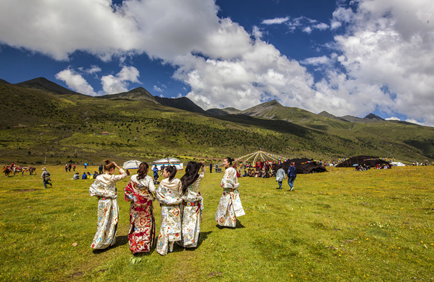 木雅民族的鍋莊跳起來了,穩(wěn)沉而有力,多情而悠長,在雪峰環(huán)繞的庇護(hù)下,“木雅辛康”(意為天堂般的木雅地方)歡樂的歌聲盈滿了整個(gè)山谷。
