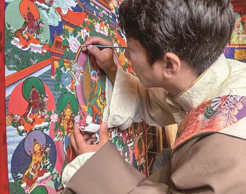 “唐卡作為中國民族繪畫藝術(shù)的珍品,不僅呈現(xiàn)精湛的技藝和美學(xué),更是傳遞一種文化?!睏畹潜硎?,他作為一名縣級非遺傳承人,要在繼承傳統(tǒng)技藝的基礎(chǔ)上,采用多元藝術(shù)技藝賦予傳統(tǒng)唐卡更多創(chuàng)意,讓民族文化瑰寶能夠更好地發(fā)揚(yáng)光大。