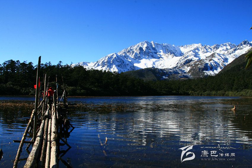 沒走幾步,眼光一下就被海子右前方(西北方)的那幕雪山倒影圖給攫去了。哇,好漂亮!白老師所言的“杜鵑海很漂亮”簡直名符其實咧。