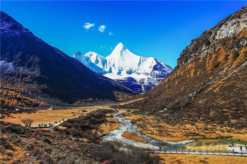 早餐后從稻城出發(fā),翻越海拔4513多米的波瓦山,途徑亞丁村,抵達(dá)目的地亞丁景區(qū)。國慶節(jié),亞丁景區(qū)迎來了高峰的人流,排隊(duì)等候景區(qū)大巴車的游客,從大廳排列一直蜿蜒到大門口,經(jīng)過2小時(shí)漫長的等待,終于抵達(dá)景區(qū),徒步步行到?jīng)_古寺,景區(qū)里已經(jīng)人滿為患,眼前的亞丁秋色,讓我們忽略了身邊擁擠的人群,只顧欣賞由草地、森林、小溪和嘛呢堆組成的天然沖古草坪。沿著沖古寺仰望仙乃日神山而上,往返約3公里步行約2小時(shí),一步一步來到美如仙境般的珍珠海;返回山下,繼續(xù)乘坐景區(qū)電瓶車到達(dá)洛絨牛場,返程順溪流而下。當(dāng)天入住香格里拉鎮(zhèn)日松貢布酒店。