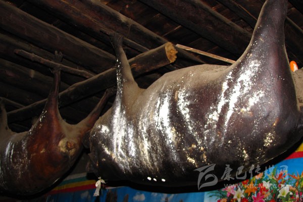 豬膘:在丹巴,豬膘是一種貯存豬肉的方式,是一種飲食習俗,同時,它又是財富的象征。在丹巴隨便走進一戶人家都可以看到少則幾扇、多則十余扇的豬膘掛在樓上,有些人家的豬膘甚至還貯存十多年之久。這些豬膘大多已經(jīng)被蟲吃掉了許多,但是他們也不會心痛,因為在過去,看一個丹巴人家庭是否富裕,就看他家有多少豬膘,豬膘越多就越富有。