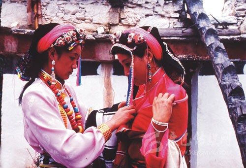 康裝重腰帶,有實(shí)用裝飾作用,腰帶一般寬、軟、長??刀~通區(qū)腰帶最長,常在腰際纏繞數(shù)因。牧區(qū)腰帶強(qiáng)調(diào)色澤、重象征性。牧區(qū)婦女著長袍束腰后,再系一條色澤質(zhì)地均上乘的綢帶,并將帶兩頭長懸于腰后兩側(cè)作飄帶。農(nóng)牧區(qū)婦女為勞動(dòng)時(shí)保護(hù)長袍,常系一圍裙,多以黑、蘭平市為料。節(jié)日時(shí),青年婦女圍“邦典”彩條普魯裙。農(nóng)牧區(qū)中老年婦女,為保護(hù)腰部,還常在后腰圍一種用羊皮或棉花蕊、毛呢棉布為面料的腰墊。